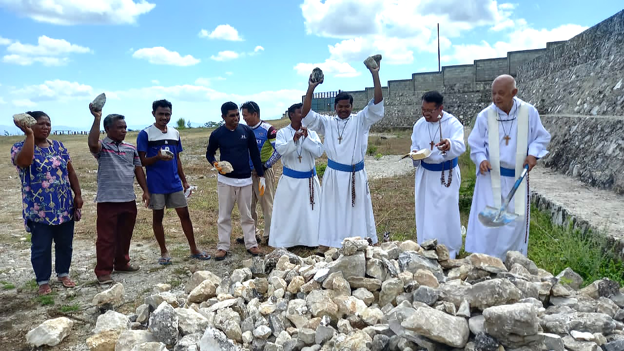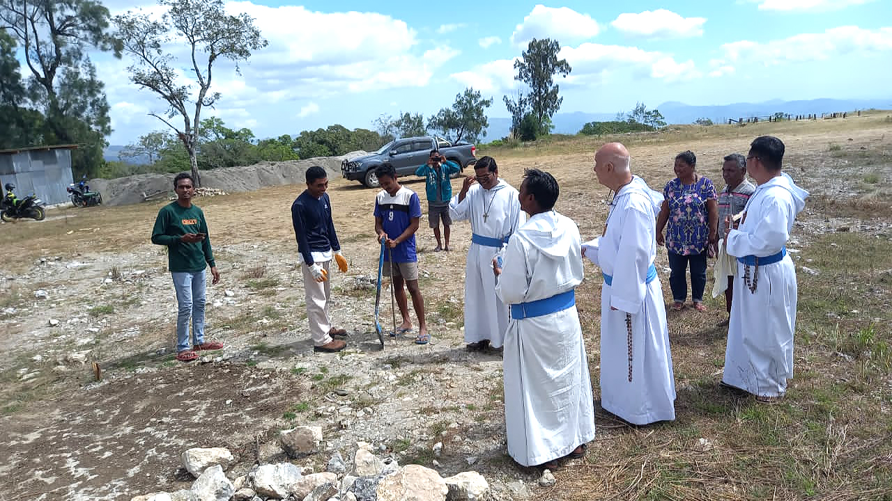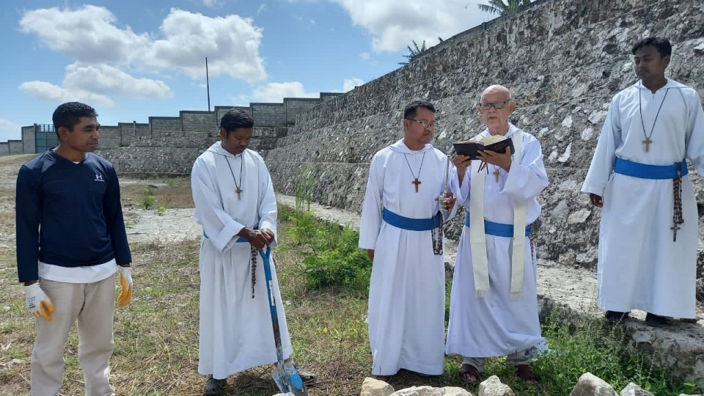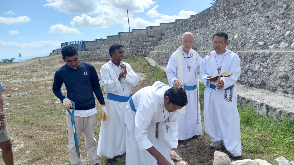 Several brothers have arrived from Jamaica who have building experience, and they will be supervising the building of the monastery/day use building. The land is levelled, with a terraced retaining wall on the upper side, and is totally surrounded by a boundary wall. The level section of the property where the building will be has been cleared of vegetation and the first turning of the soil was conducted by a surprising visitor to the Timor Leste mission. Yes, the Founder, the Very Reverend Fr Richard Ho Lung was returning from the Philippines in July and finally visited the two missions (Flores and Timor Leste) that he was still to visit. Now that the official turning of the soil has been done and the property is blessed, building will now commence.