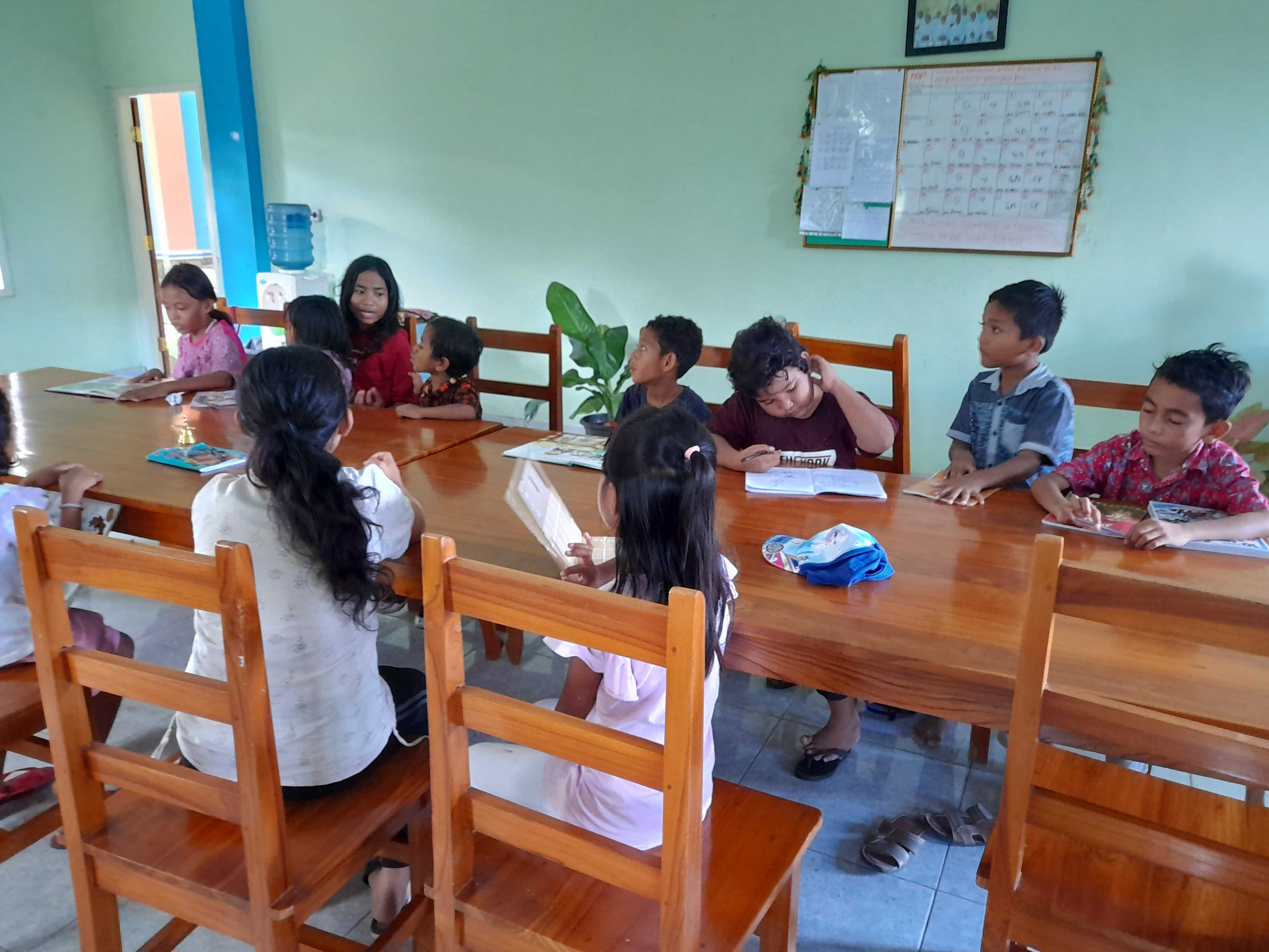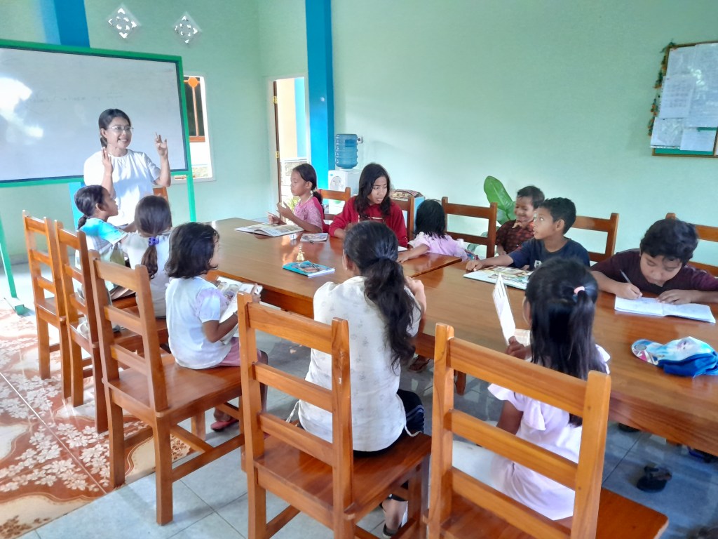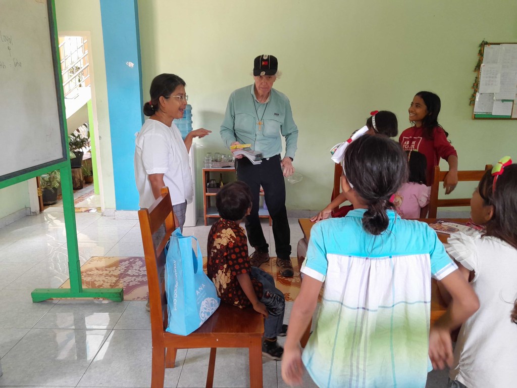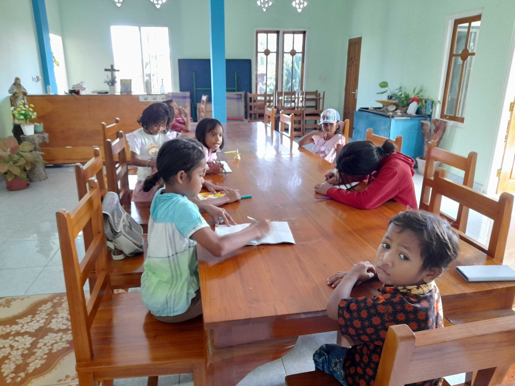 The local children come and are taught English and some catachesis by a local lady named Erlin Imelda who, with her husband, Layu run a lovely bed and breakfast in Labuan Bajo called PaVilla. She volunteers every week to teach the children and she has been helping with these classes for the last 12 months. Compliments of the Australian visitors, on the Sunday of 3 December, the children were treated with some gifts of school stationery.