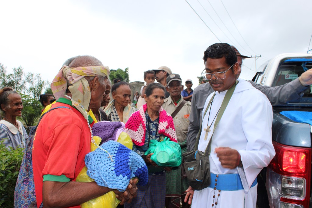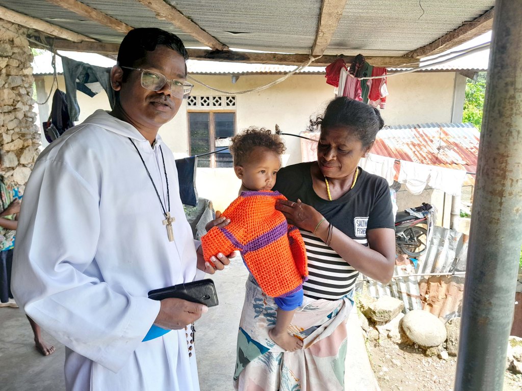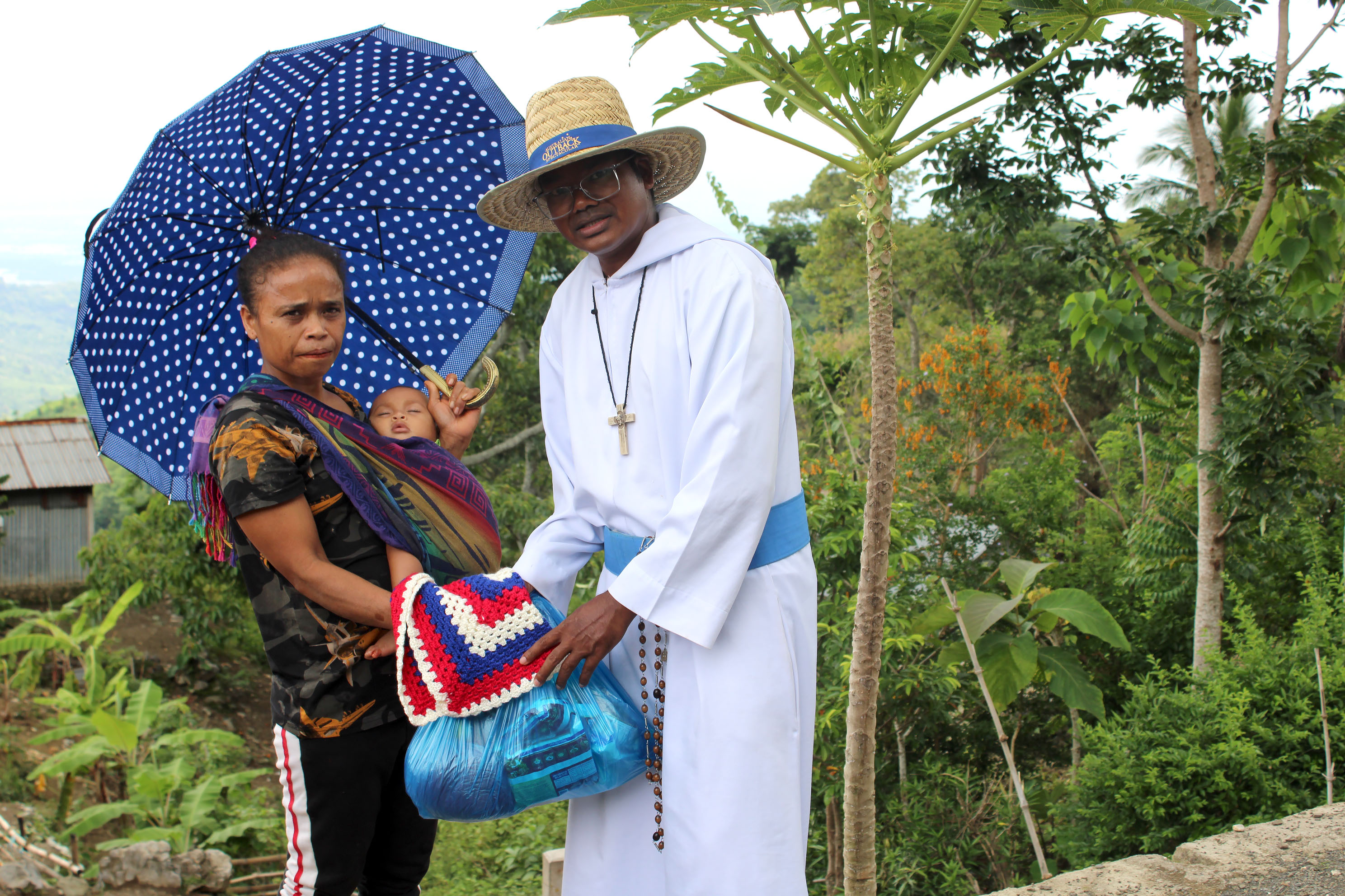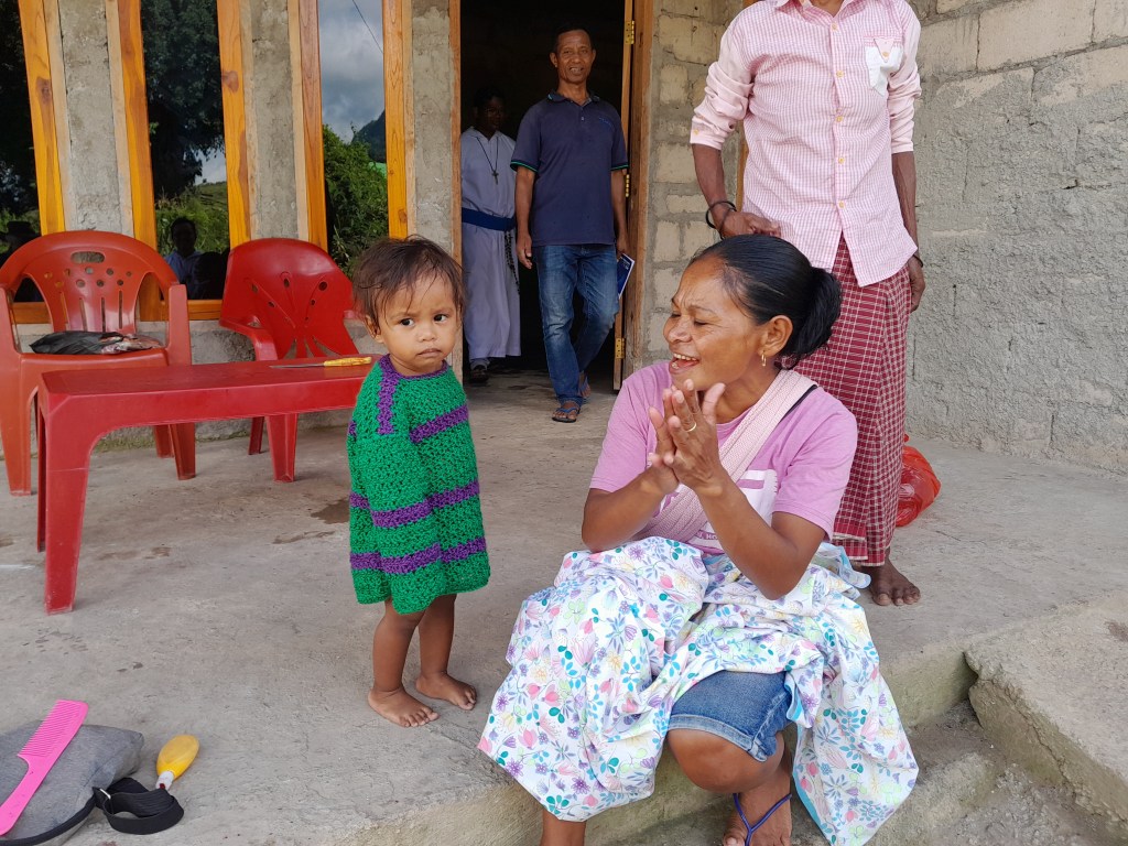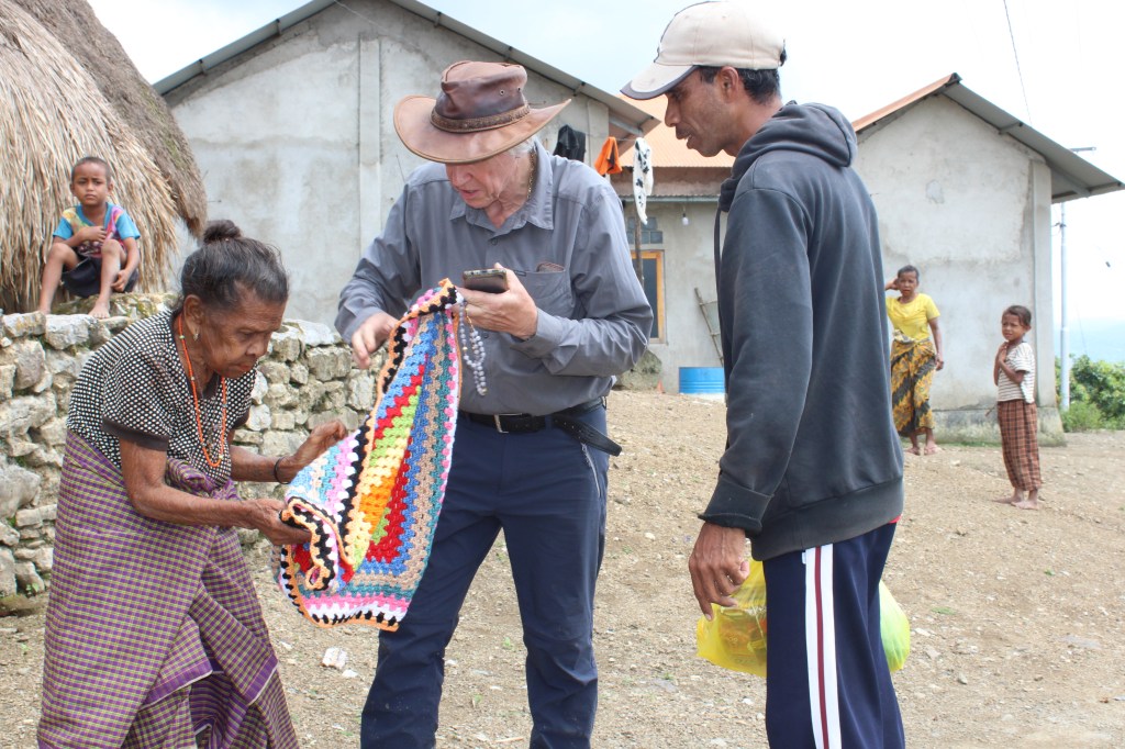 Br Bima was our driver. Together with the food parcels they distributed rosaries and home made blankets. These crocheted blankets were made by ladies of the Holy Family Parish, Indooroopilly. Additionally, a lady parishioner crocheted several jumpers for the young children of the village. Saburai village at 900 m above sea level does get cold during winter. The people really appreciated and loved the brightly coloured blankets.